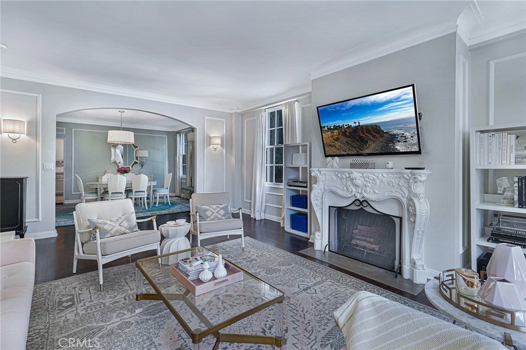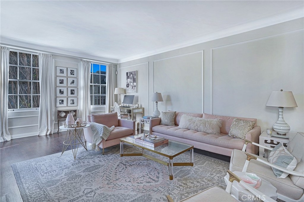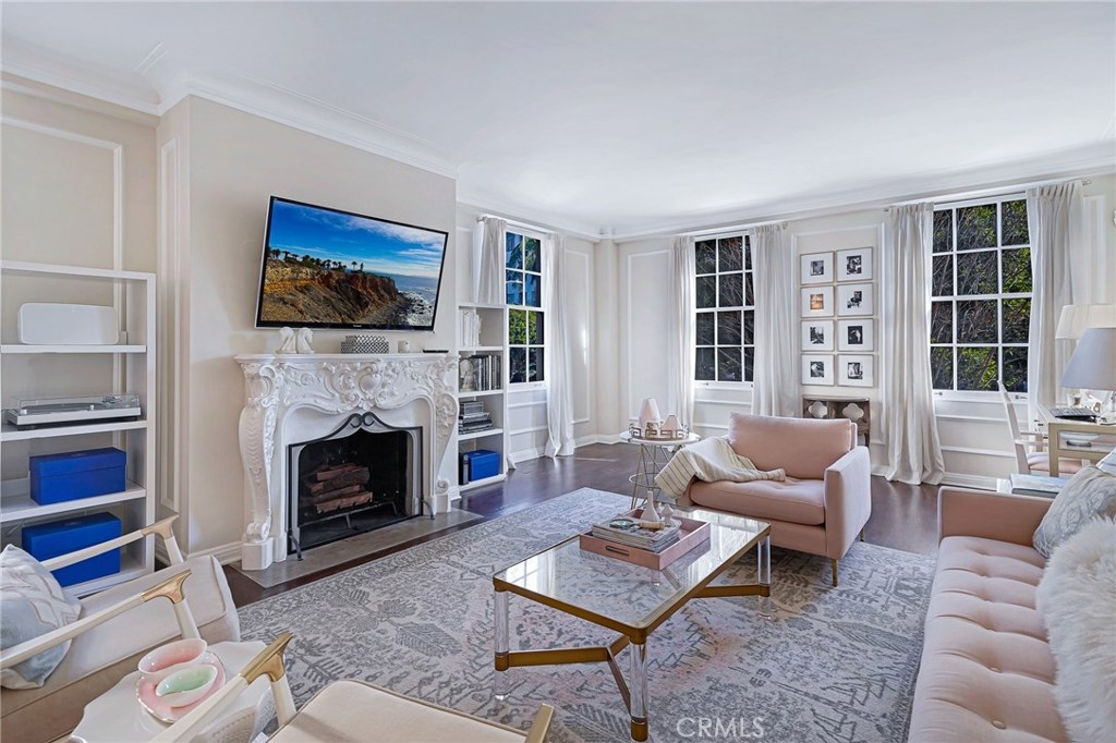 Chateau Chaumont is a beautiful 1928 Historic French Revival building in the heart of Ktown. Shopping, restaurants, The Wiltern are all within walking distance. This beautiful 2nd floor corner unit offers 2 large bedrooms, including a primary suite w/ a private 200 sf balcony. Both bedrooms have walk-in closets. This elegant home is the perfect combination of unique historic details combined w/ modern amenities. Ebony-stained original hardwood floors & 9' high ceilings. The walls have gorgeous picture-frame molding & original crown molding. The entry consists of a dramatic oval foyer w/ whimsical wallpapered ceiling. A spacious formal dining room & light-filled living room features an exquisite decorative fireplace w/ a French plaster mantle. The galley kitchen has been recently upgraded to include Bertazzoni & Bosch appliances, Carrara marble countertops, Walker Zanger backsplash tile, an LG washer dryer combo, new Rohl sink, Newport Brass faucet & Smith & Noble custom window shade. Modern upgrades include soothing interior colors, Mitsubishi Ductless mini split AC/Heat system in dining room & bedrooms, custom window shades in bedrooms from The Shade Store & Smith & Noble. +2 secured parking spaces. The building also has a rooftop deck & additional storage unit on the top floor. Truly a unique property. Chateau Chaumont is a Mills Act approved building & has been used many times as a filming location which can offer owners additional income should they choose to participate