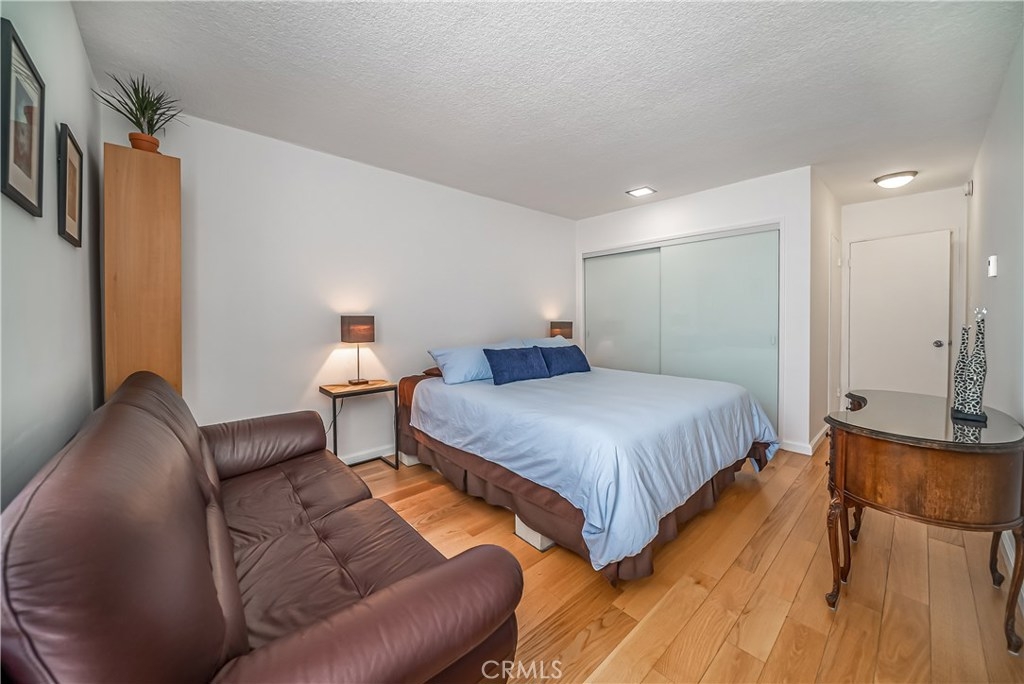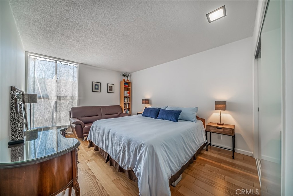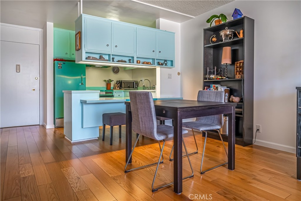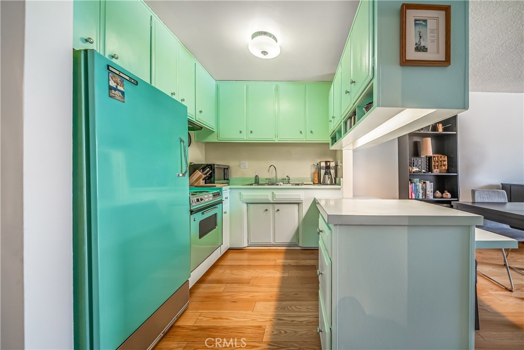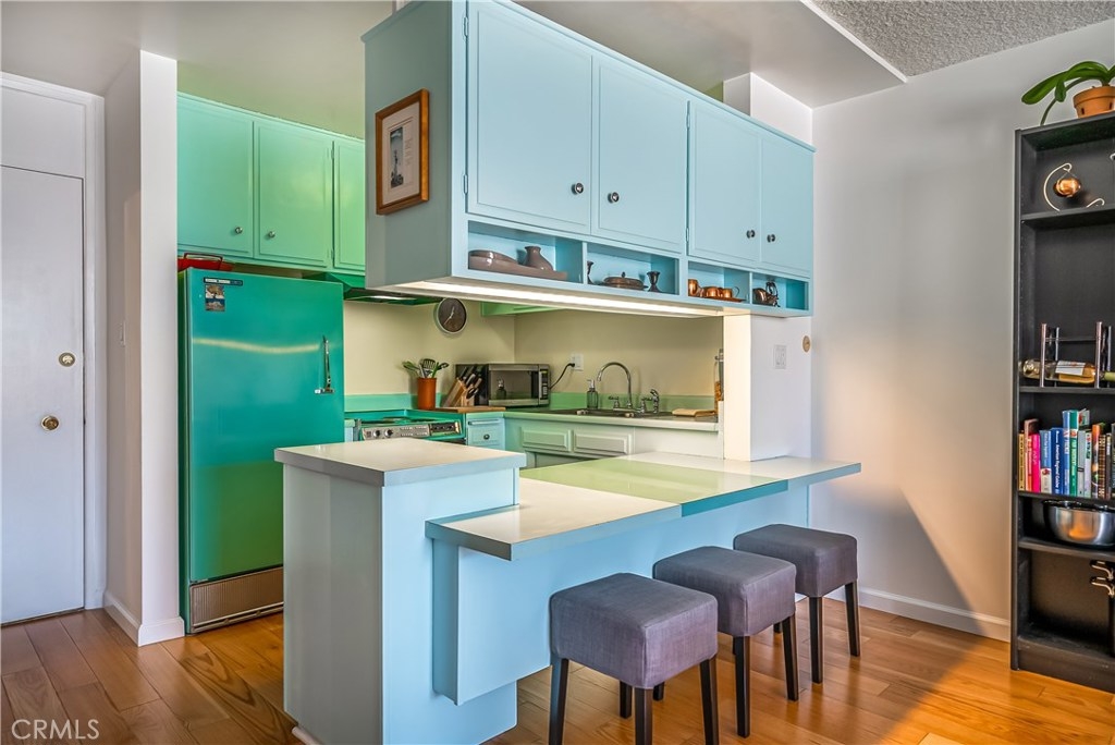 Welcome home to this bright and cheerful one bedroom one bath condo with amazingly cool retro vibes! Prime Hancock Park location close to Larchmont Village shops and restaurants, The Wiltern and Western Avenue. This quiet top floor unit features an open concept floor plan with recently upgraded hardwood flooring throughout. The vintage kitchen features a breakfast bar that opens to the dining area and an abundance of storage. Located off of the living area is a balcony perfect for your morning cup of coffee or to enjoy the evening sunsets. The spacious bedroom has a large window with beautiful treetop views and two closets. The retro theme continues into the pristine bathroom with black and white tile floors, tons of counter space, and a vanity area. Other highlights include a rooftop deck, with views of Griffith Observatory and the Hollywood Sign, newer air conditioning unit, and fresh paint.