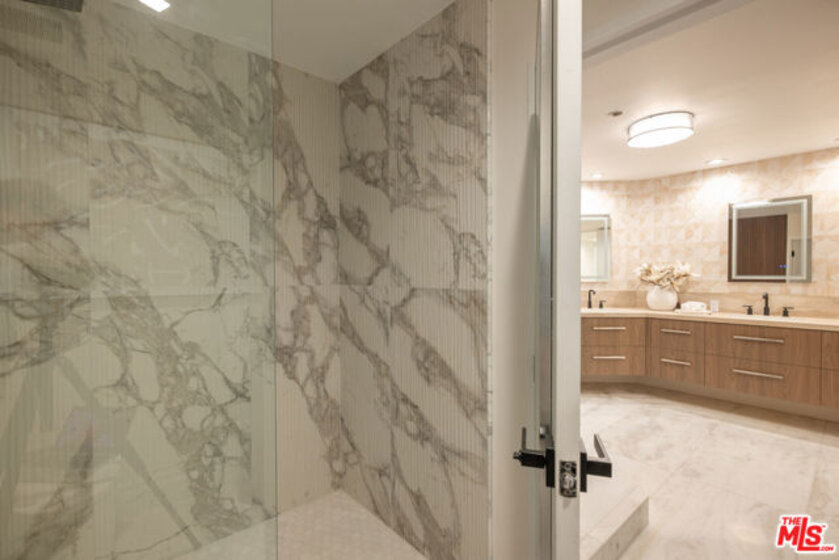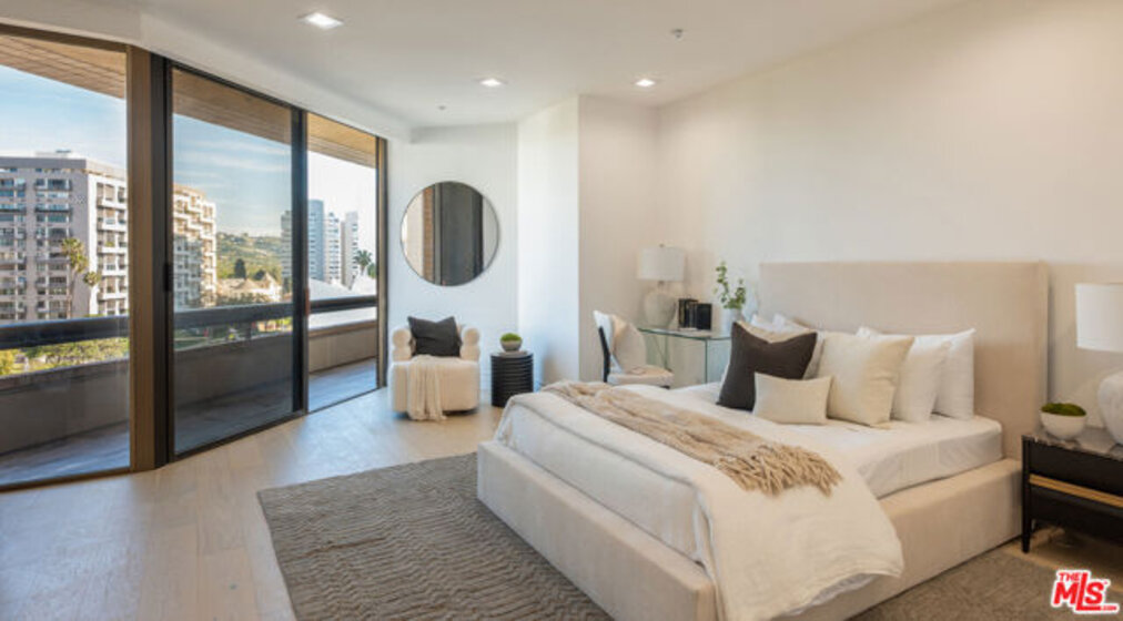 High above the Wilshire Corridor, on a northeast corner within the Mirabella, this expansive residence spans more than 2,800SF and unfolds like a private gallery in the sky. The entry foyer creates an elegant introduction, as the home opens to sweeping 180-degree views across Little Holmby and the sparkling city lights beyond. Wall-to-ceiling glass lines every room, drawing in natural light and extending the interiors outward to two balconies each tiled in reclaimed wood porcelain and accessible from every principal space. High ceilings and recessed lighting heighten the sense of volume, while newly finished, contemporary white oak hardwood floors run continuously throughout.The great room is arranged with intention, offering two distinct seating environments: a formal conversation area anchored by a fireplace and porcelain travertine accents, and a relaxed lounge oriented toward the view. A wet bar with seating supports effortless entertaining, while green and black built-in cabinetry wrapped in designer wallpaper provide curated storage. The kitchen balances function and finish with custom cabinetry featuring honed porcelain countertops and a full Viking appliance package with Sub-Zero refrigerator and Sharp micro drawer. Adjacent dining space captures the skyline as a daily backdrop.The primary suite incorporates a sitting/office area and custom closets, with an accent wall wrapped in Aztec grass cloth. The luxuriously appointed ensuite showcases marble flooring and fluted marble tile within the shower, a Thassos marble shower floor, toilet-bidet water closet and custom walnut vanity. The guest suite mirrors the level of finish, featuring honed marble and pearl handmade tile, vanity, and porcelain travertine surfaces. Additional amenities include the bespoke powder room, laundry room with brand new LG ventless washer and dryer and upgraded AC vents, a Nest smart thermostat, designer vanity pulls throughout, and LED mirrors in every bath.Residents of the Mirabella enjoy 24-hour concierge and valet, pool and spa, fitness center, EV charging, conference facilities, and recent upgrades to the motor court and common areas. HOA dues of $3,649 per month cover water, sewer, trash, gas, DirectTV, internet, and earthquake insurance. Moments from Homby Park, Beverly Hills, Century City, Westwood Village, and UCLA, the home offers the privacy and proportion of a single-family residence within a full-service high-rise setting.