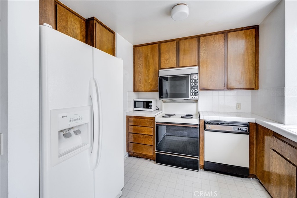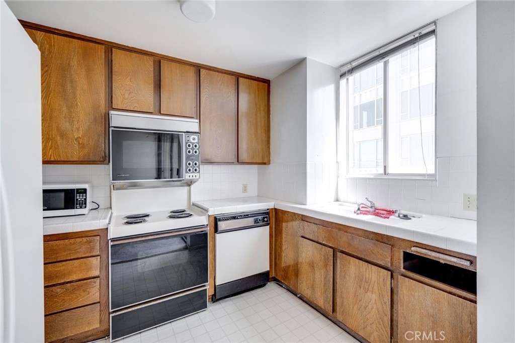 Charming condominium in Wilshire Selby Towers East. Located on Wilshire Blvd in between Selby Ave. and Manning Ave. This condo is great a great find! Condo needs updating but is clean, functional, and ready for a new owner. 1 bedroom, 2 bath full baths, and 900 sqft inside. Entry opens to full guest bath on the left with large vanity and separate shower. Living room also extends from front entry and is quite spacious with closet space and outdoor patio. To the left of patio is the kitchen with retro cabinets, tile-counter tops, and fridge (included). Primary bedroom is roomy with good closet space, separate vanity with sink, and partial view of Hollywood Hills. Full bath w/ shower and bath tub sits across from vanity. Condo includes one parking space storage areas in gated garage. 24-hour doorman. Community pool. Once again, this condo needs updating but is a great find with wonderful potential!