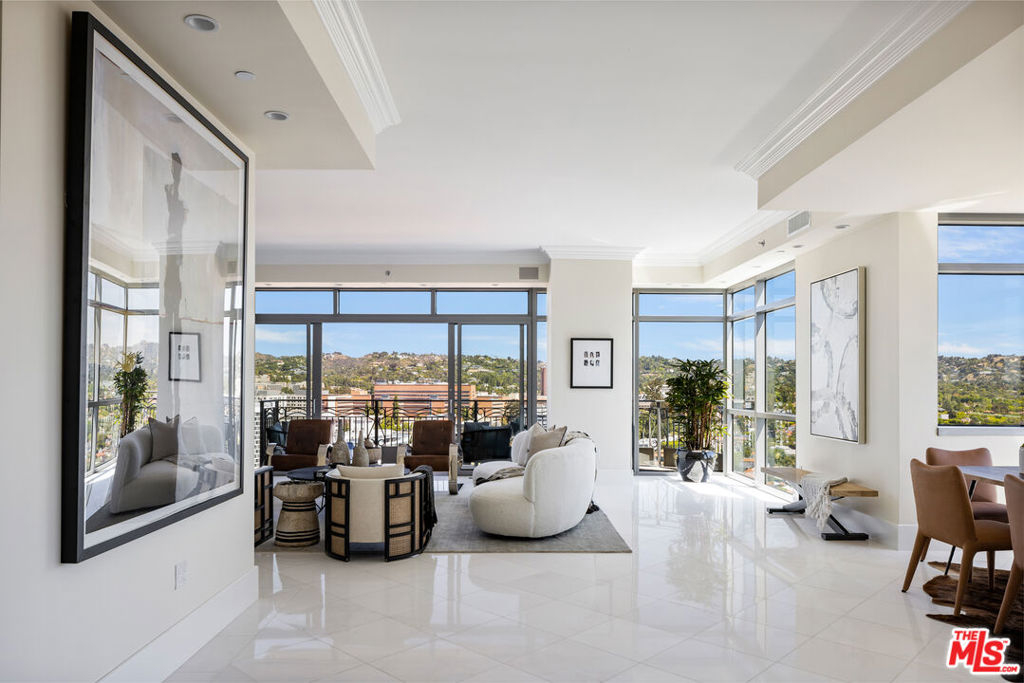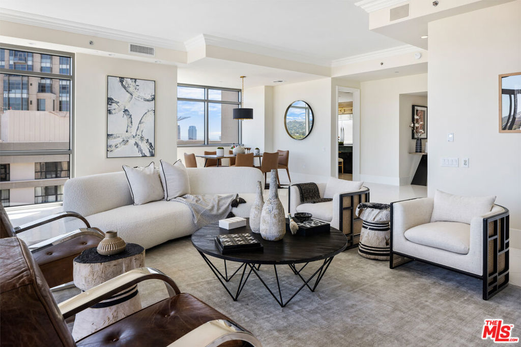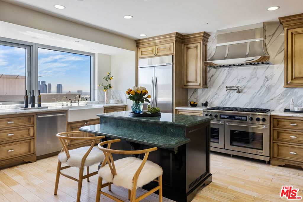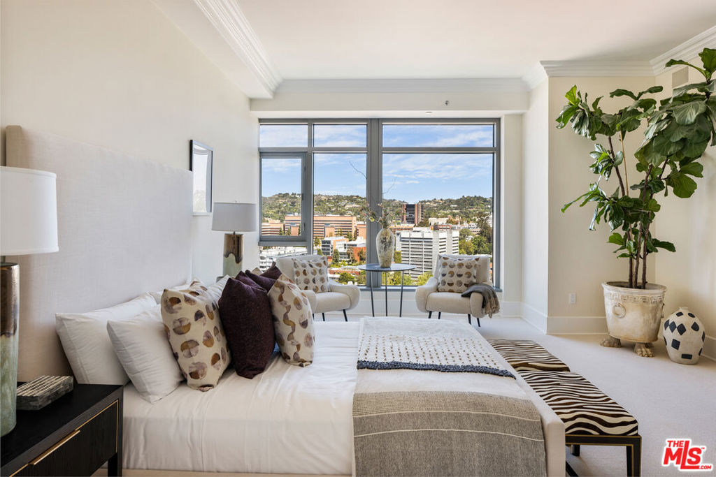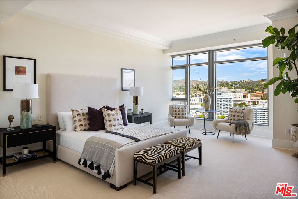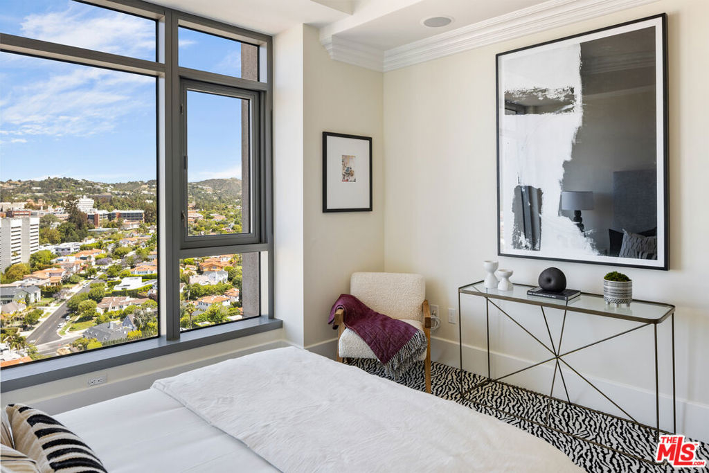 Rare high floor NE unit in the undisputed champion of the Wilshire corridor: The Californian. Designed with touches of Art Deco, nothing comes close to the grand yet refined comforts of this building. Accessed through private elevator, this sky home is flooded with light and surrounded by jaw dropping views. Marbled living room and dining features large fireplace and sweeping vistas of Los Angeles, from its floor to ceiling windows and large sitting balcony. Cook's French country inspired kitchen w/professional appliances, plentiful storage, farmhouse apron sink and centre island w/drop down bar for seated dining. Large primary suite w/ 2 walk in closets, luxurious hotel bath w/ sitting vanity, walk in shower, tub and toto washlet. This home also features 2nd bedroom w/en-suite bath, powder room, and laundry room w/separate service entrance. Every amenity is provided in this total full service building including state of the art fitness centre, pool w/separate spa area, outdoor fireplace lounge, dog walk, wine storage, 24 hour valet/security. The pinnacle of elegance.