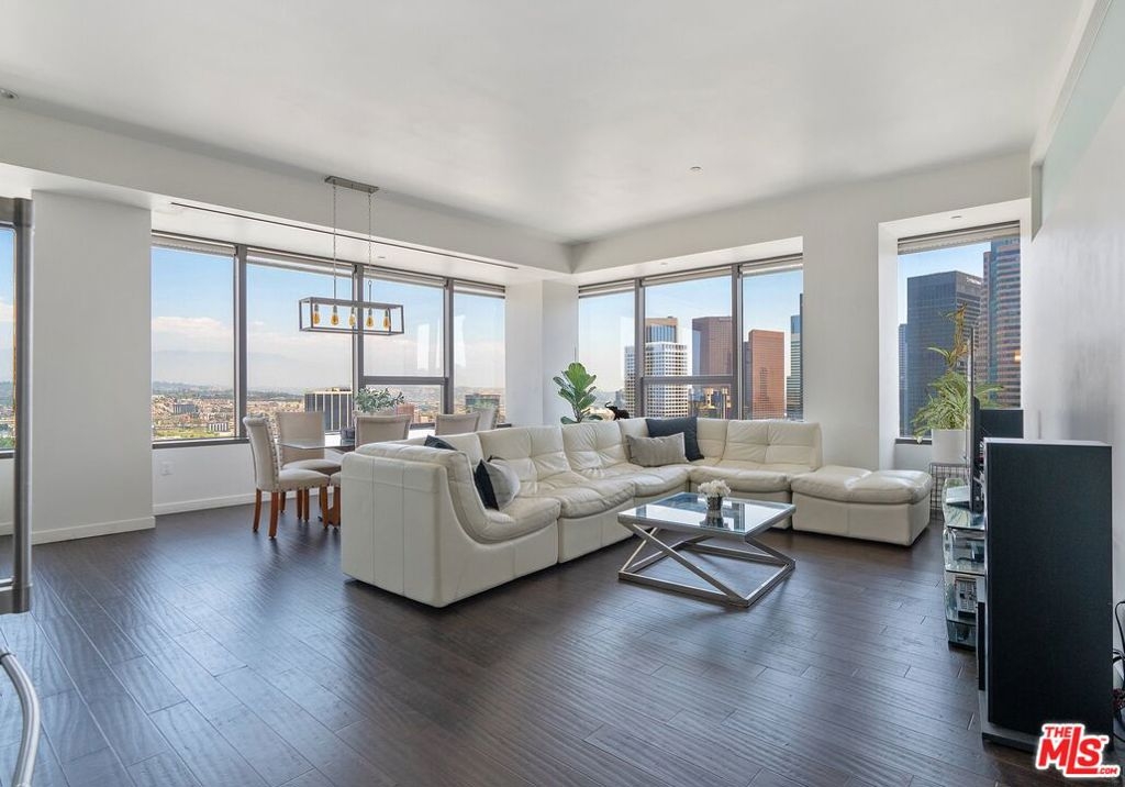 Welcome to an exquisite two-bedroom, two-bathroom corner residence located at 1100 Wilshire, where luxury living meets breathtaking views. This exceptional home presents an awe-inspiring panoramic vista of the vibrant Downtown Los Angeles skyline to the east, while treating you to the serenity of picturesque hills to the north. Situated on the 28th floor, this condo offers a spacious and inviting living space spanning approximately 1,423 square feet, adorned with elegant wood floors throughout. Indulge in culinary delights within the modern kitchen, boasting stunning granite countertops, complemented by sleek European-style cabinetry and top-of-the-line GE Profile appliances. The private and expansive main suite awaits, featuring a luxurious en-suite bath complete with a separate tub and shower, dual vanity, and a generous walk-in closet. Additionally, a second bedroom and bath, along with a laundry closet equipped with a washer and dryer, provide all the comforts you desire. Ample storage is available with a coat closet as well. Enhancing your convenience, this remarkable home includes two reserved parking spaces, ensuring hassle-free parking for you and complimentary guest parking. The community offers a wealth of resort-style amenities, including an extraordinary 17th floor sky deck where you can bask in the infinity pool, relax in cabanas, sizzle up a barbecue on the grills, or gather around the fire pit. For entertaining, there is a private dining area, ideal for al-fresco dining with friends. Stay active and healthy in the fitness center, host meetings in the conference room, or enjoy movie nights in the media room. The 24-hour attended lobby provides an added layer of security and convenience. Centrally located, this residence places you in proximity to world-class dining, the financial district, Wilshire Grand, LA Live, and the vibrant offerings of Downtown LA. Prepare to immerse yourself in the finest urban living experience.