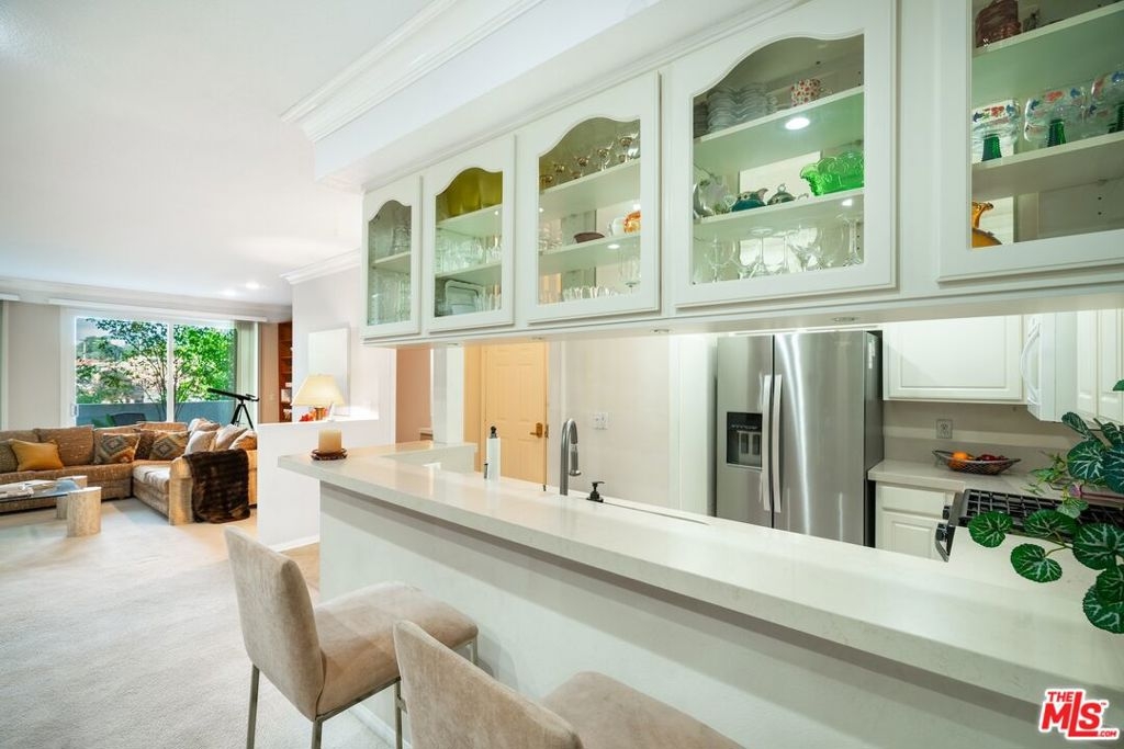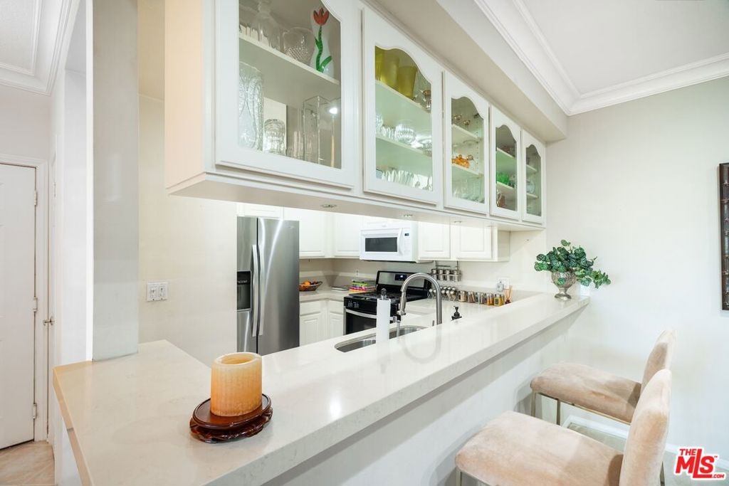 Brentwood Adjacent Secluded Corner Retreat! Expansive layout of approx. 1443 sqft with double door entry way opens to your tiled foyer. Spacious living room with crown moldings and travertine fireplace with extensive built-ins and shelving throughout the living area. Enjoy your peaceful mornings in your private patio overlooking lush greenery. Tailored kitchen with quartz countertops and a wealth of cabinet space and a generous counter seating integrates seamlessly with the kitchen layout. Full scale dining area that can accommodate formal evening banquets. Central Heat/Ac and dedicated full size laundry area. Primary suite with a spacious walk-in closet and private outdoor lounge, Extensive custom cabinetry in 2nd bedroom for dedicated workspace. Secured 2 car parking and homeowners dues include water and earthquake insurance. Enjoy unrivaled access to Sawtelle Blvd with diverse array of dining and shopping options, Close to UCLA , Santa Monica, Century City and Freeway access