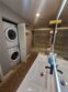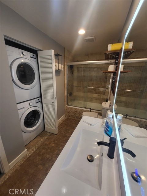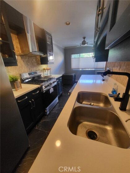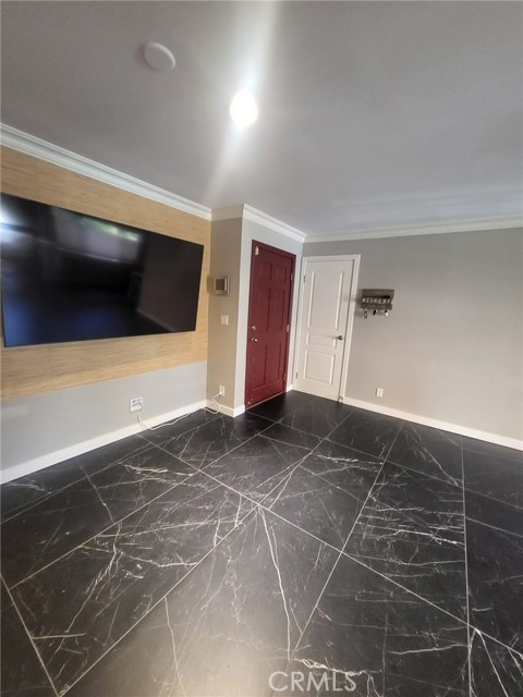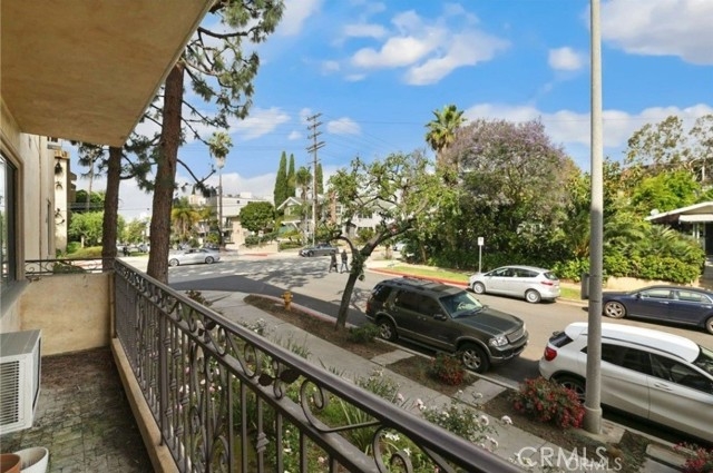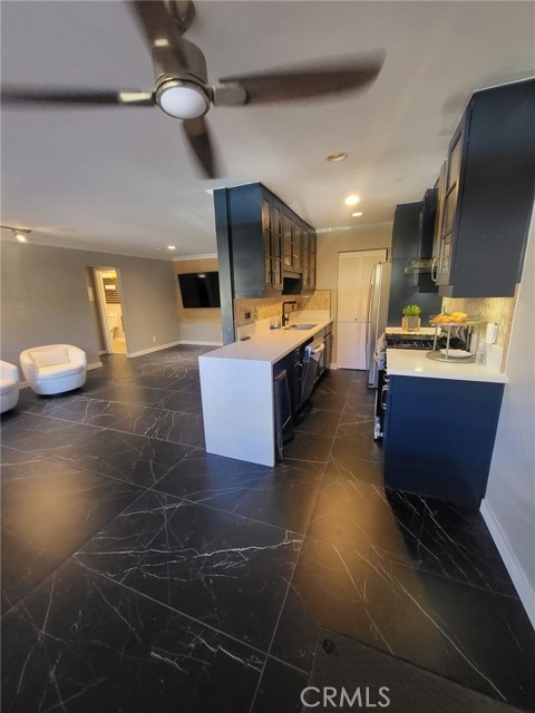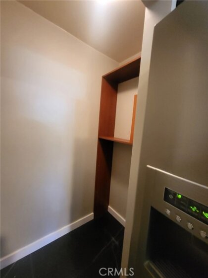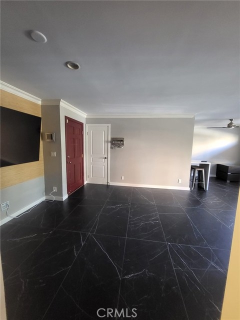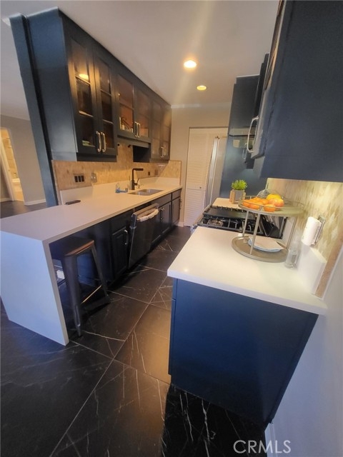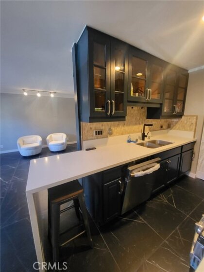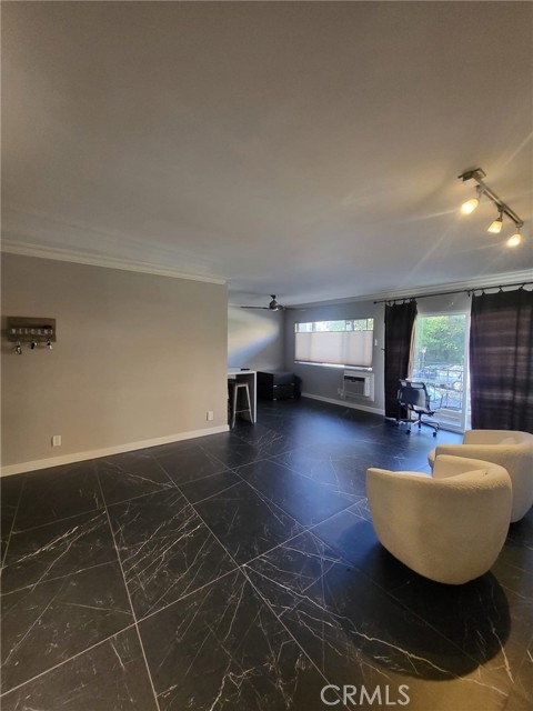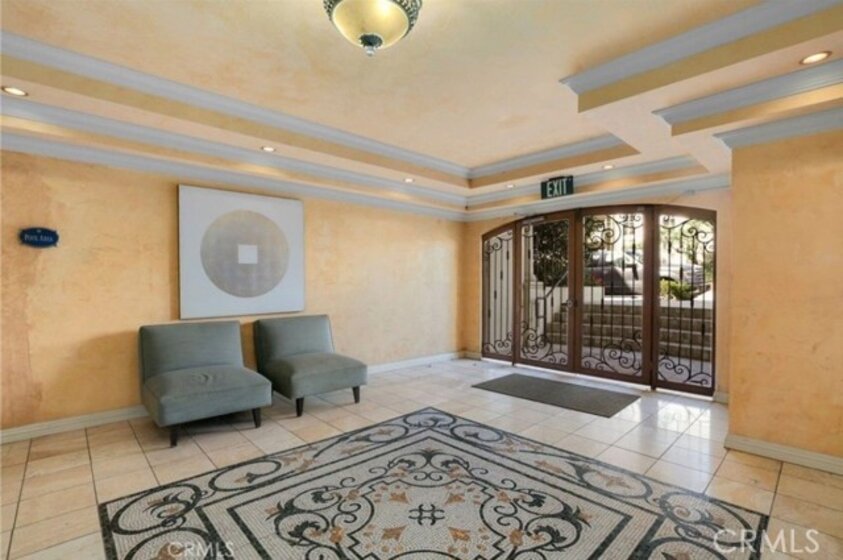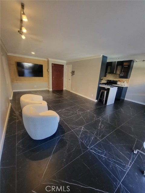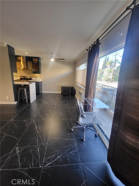 Modern, move-in ready 1BD/1BA with balcony in gated Brentwood Villas. Sunlit, north-facing, single-level home features an open living/dining area finished in oversized marble-look porcelain tile, crown molding, recessed/track lighting, and a ceiling fan. Designer kitchen with white quartz counters and a waterfall peninsula for stool seating; full-height travertine backsplash; custom dark cabinetry with glass uppers; matte-black faucet; double-bowl sink; pantry/utility niche; and a stainless appliance suite including a 5-burner gas range with chimney hood and dishwasher. The spacious bedroom offers bamboo flooring, a ceiling fan, and a walk-in closet with built-ins. Updated bath showcases a floating vanity with LED mirror, stone mosaic tile, and a tub/shower with glass enclosure. In-unit stacked laundry behind louvered doors. Private balcony overlooks a tree-lined street—perfect for morning coffee. Community amenities include a pool, dry sauna, renovated fitness center (2020), secure lobby with elevator, and gated entry; HOA includes earthquake insurance. One assigned gated parking space. Additional highlights: a true cook’s kitchen with long prep runs and abundant cabinet storage—the peninsula doubles as a breakfast bar and serving counter. Expansive approx. 23-ft living room accommodates a full dining set plus a work-from-home nook; wide windows and smooth ceilings amplify light and volume. The bedroom fits a king bed with nightstands; the closet provides generous hanging and shelving. Practical upgrades include modern hardware and ceiling fans in both rooms. Exceptional location on a quiet, tree-lined street between San Vicente and Wilshire—moments to coffee shops, restaurants, markets, and the weekly Brentwood Farmers Market; convenient to UCLA, the Getty, Santa Monica beaches, and the 405/10. Approx. 728 sq ft per floor plan.