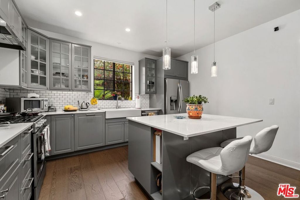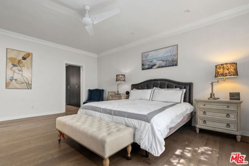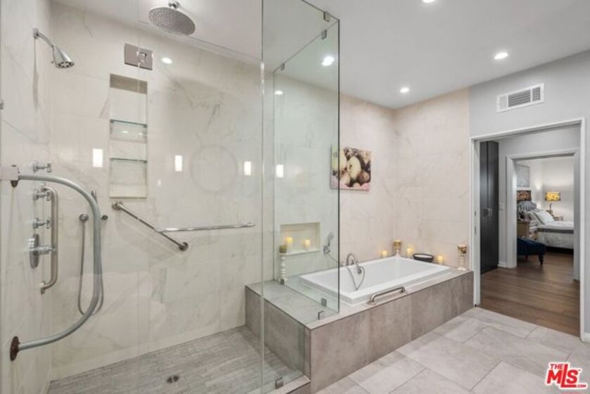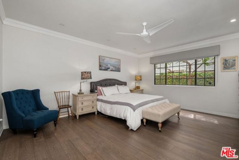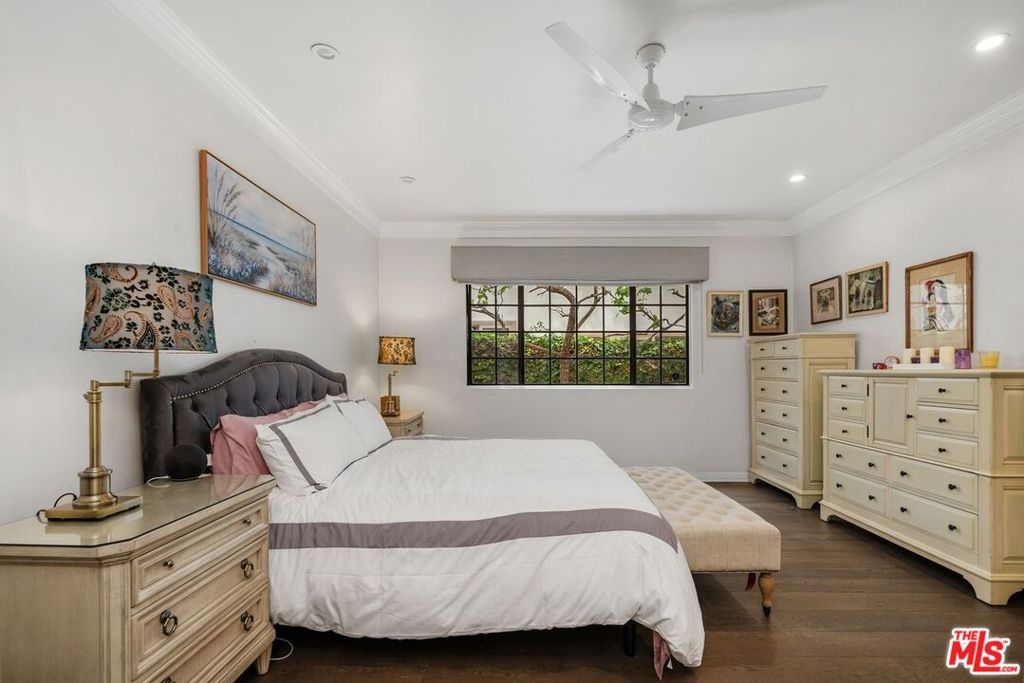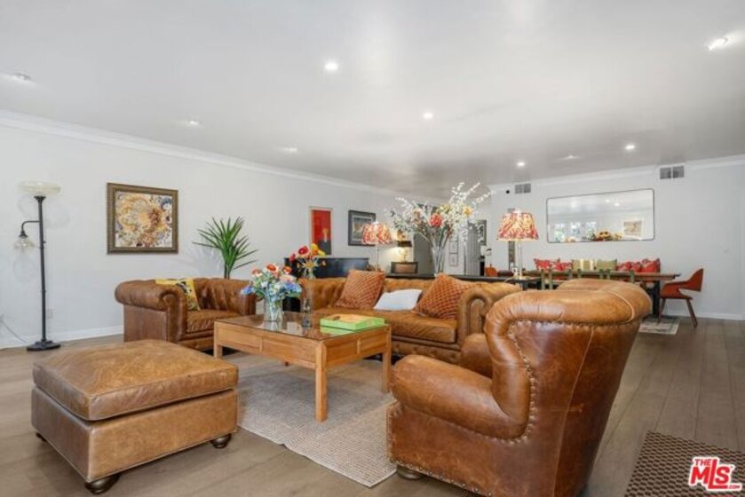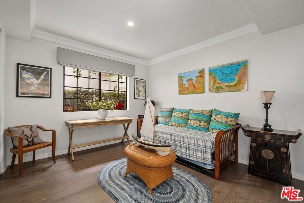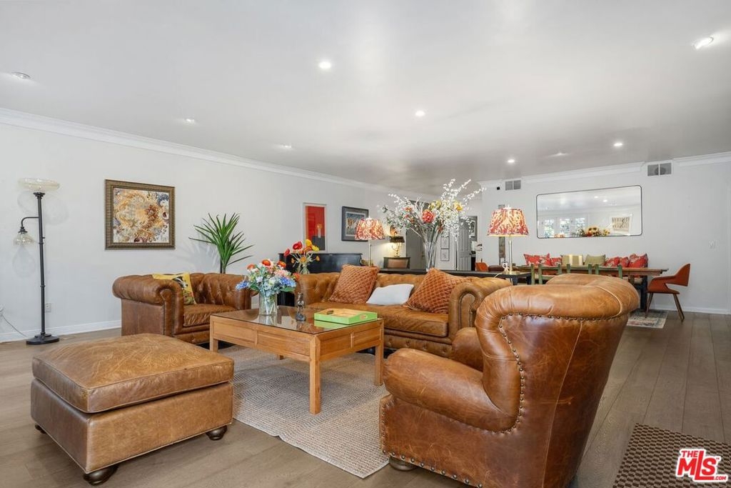 Discover this spacious, single-level home in the heart of Brentwood . . This 2 (+ 3rd bed / office - with closet) bedroom, 2.5 bath, 2300+/- sq foot corner unit boasts generous room sizes, custom Roman Shades, nearly 9-foot ceilings, wide-plank, wood floors and dimmable recessed lighting throughout. . . just steps to the many shops & restaurants of Brentwood Village. Come in through the elegant double-door entry. Everything in this unit is on a grand scale and feels like a single family home. The enormous living/country dining room has a working fireplace, plenty of room for a grand piano and opens to a spacious, private patio (with brand new flooring) with lots of room for several seating areas. The extra-large cooks kitchen features glass-front cabinetry, a breakfast bar, built-in wine rack, stainless appliances (including an LG ThinQ smart refrigerator and LG dishwasher, new circa 2023), farmhouse double sink, center island, windows facing two directions, under-cabinet lighting and seeming endless storage. Huge primary suite includes a ceiling fan, custom closet with jewelry drawers. Sumptuous bath with dual sinks, a separate soaking tub with wide surround (perfect for candles) & over-size, frameless shower enclosure with body-washer. Good size secondary bedroom with an entire wall of closets. Third bedroom/office with built-ins and closet. Good size laundry room with generous storage and shelving. Huge linen closet in hallway. This building was built as condos. Building garage is at street level. No stairs from garage to elevator to unit floor . . . . Please see "Doc(s)" link (above) for additional HOA information. Please see the "Virtual Tour" link (above) for the self-directed, 3-D virtual tour.