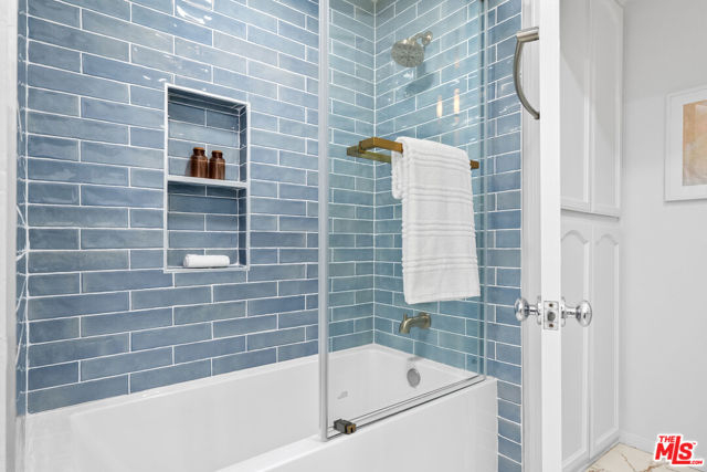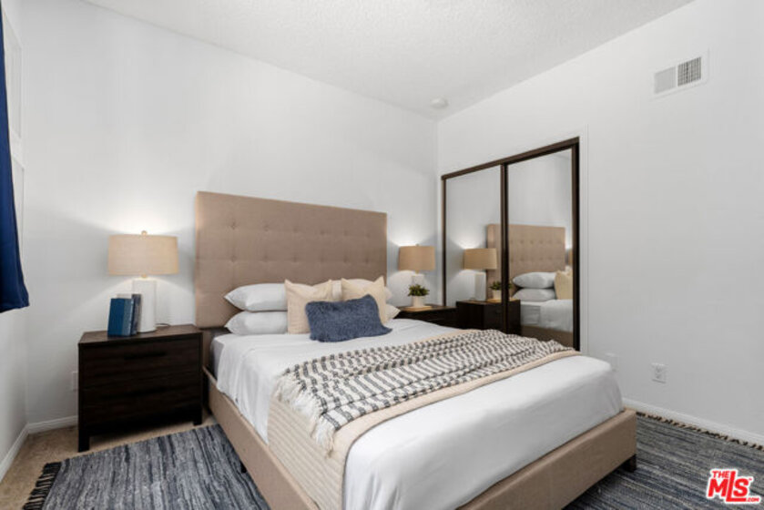 Stylish living awaits! Single level 2 bedroom + 2 bath condominium well located between Wilshire and San Vicente just East of Bundy in Brentwood. Front facing second floor unit opens to living room + dining room with gas fireplace and doors that lead to private terrace. Large living area opens to recently updated kitchen with breakfast area. Primary suite boasts a large walk-in closet and newly remodeled en-suite bathroom accented with glass tile and gleaming fixtures. Second bedroom, hallway bath and laundry closet with full size side by side W/D complete the unit's floor plan in 1,371 SqFt. Brand new HVAC and ducting completed within the last year. Outside entry into the single level unit. The 1982 building is located on a quiet tree lined block. Wood laminate flooring featured predominantly throughout the living space with bedrooms carpeted. Storage options abound with extra closet in the foyer entry and a private storage closet located within the building. 2 parking spaces, one within the garage and one located directly behind the building. Building is well maintained with many upgrades completed within the last two years, making it a solid investment. HOD includes EQ insurance, water and gas utilities.