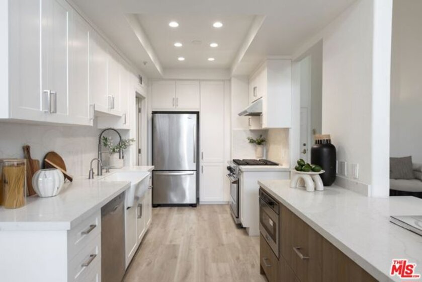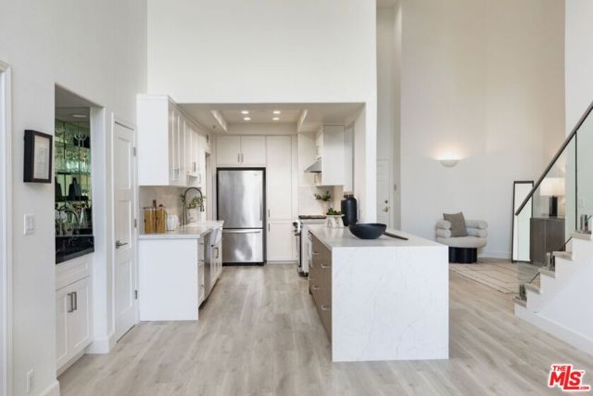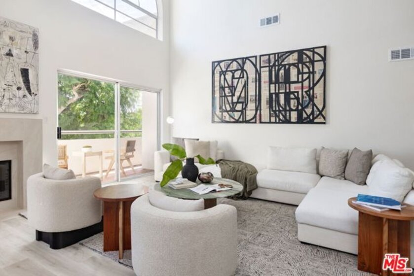 Sophisticated Two-Story Penthouse with Soaring 18-Foot Ceilings and Rooftop PatioExperience luxury living in this remodeled 2-bedroom, 3-bath penthouse with dramatic 20-foot ceilings, full southern exposure, and abundant natural light. The open floor plan features a formal entry, wood-burning fireplace, dining area with balcony, and a versatile flex space that can easily serve as a home office, den, or be converted into a 3rd bedroom. A beautifully finished guest bath with quartz and designer tile completes the main level.The chef's kitchen boasts a waterfall-edge quartz island, Viking range/oven, Bosch dishwasher, stainless steel appliances, custom pantry, wet bar, and full laundry room with built-in cabinetry. The main-level primary suite includes two closets, balcony access, and a spa-inspired bath with dual vanities, soaking tub, and separate glass shower. Upstairs, a contemporary glass staircase leads to the secondary bedroom with en-suite bath and access to a private rooftop patio with sweeping city and treetop views.Additional highlights: three private balconies, new flooring, new interior doors and hardware, two secured tandem parking spaces, and building amenities including an indoor pool, rooftop spa, and earthquake insurance included in HOA dues. Located in the highly sought-after Westwood Charter School district, near Century City, UCLA, Westfield Mall, and major freeways.