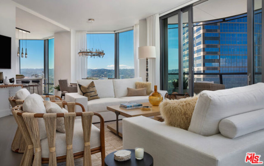 A custom-designed residence by McRae Lambert & Dunn, Residence 26C at the prestigious Century Plaza Park Elm is a one-of-a-kind one-bedroom plus den, offering unparalleled panoramic views to the north and east, facing the Wilshire Corridor and Downtown LA skyline. Upon arrival through a private elevator vestibule, you are welcomed by a grand formal entry foyer that flows into an expansive great room with 10-ft tall floor to ceiling windows. The den features rich walnut paneling and a travertine gas fireplace, creating an atmosphere of warmth and refined sophistication. The Snaidero-designed kitchen is equipped with Miele appliances and a custom slab waterfall island, blending sleek design with exceptional functionality. All rooms have operable windows which is unique in high-rise living. The primary suite offers dual custom Italian-designed closets and a luxurious five-fixture en-suite bath. Smart home features include Dual AC control, a Lutron lighting system and Palladium motorized shades. Residents enjoy world-class amenities including a resort-style pool, state-of-the-art fitness center, steam-equipped locker rooms, screening room, library, game room, personal wine storage, private dining rooms, guard-gated entry, and 24-hour concierge service.
