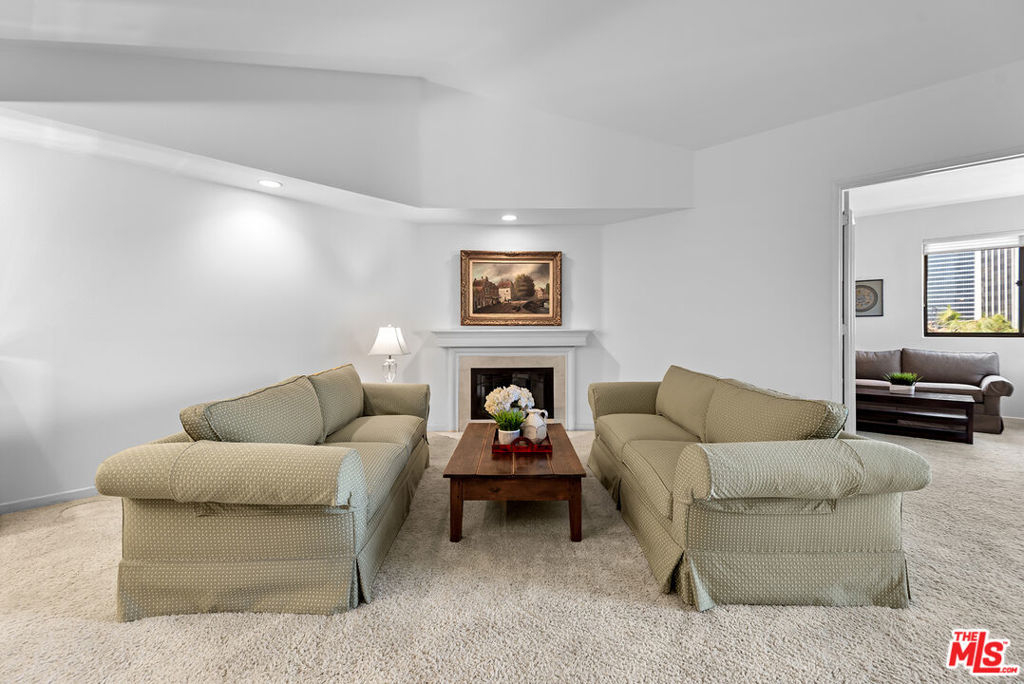 Set in the serene ambiance of the Park Place community in Century City sits this 2 bedroom and 2.5 bathroom Penthouse unit with mountain views and rare floor-plan only found in building 4. The formal entry opens to the very generous living room and dining area with high ceilings, gas fireplace and slider doors that open up to the covered balcony. The spacious eat-in kitchen opens up to the dining area and is highlighted with a curved glass block wall, recessed lighting and plenty of cabinet space for all your cooking needs. The primary suite's high ceilings enhance the volume of the room and create extra wall space for art along with the built-in cabinets, a cozy fireplace, slider doors that open up to the balcony, and a large bathroom with dual sinks and walk in closet. The 2nd bedroom suite features a full bath and views of the mountains, century city lights and the beautiful trees that frame Park Place. Additional features include: powder room, laundry room, side/side parking and storage. Park Place offers resort-like amenities with lush landscaping throughout, 3 swimming pools, tennis courts, pickle and basketball courts, a gym for each building, walking paths, and a beautiful club room.