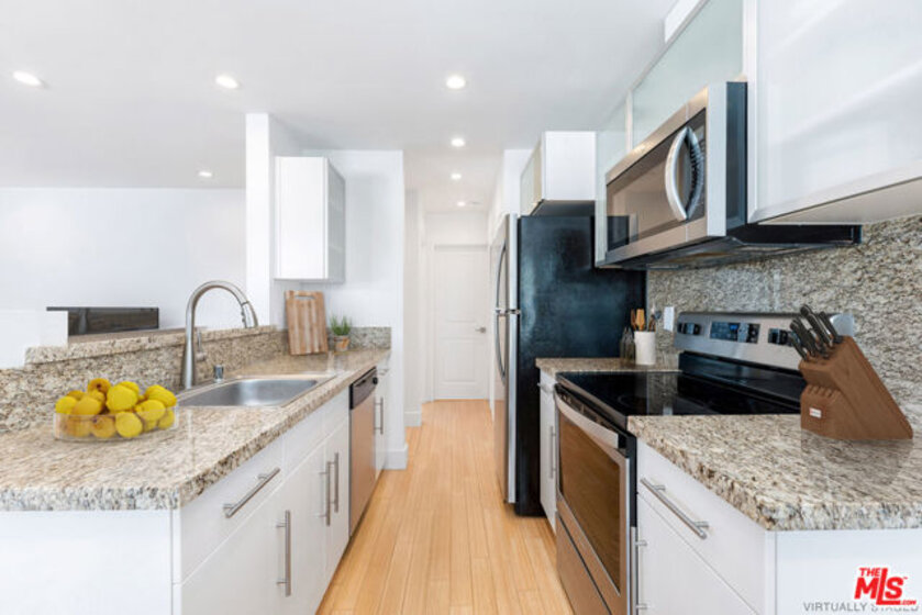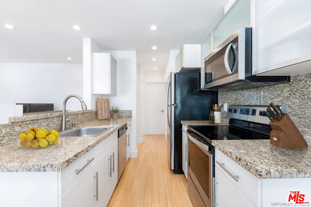 This exceptionally stylish and recently remodeled 1-bedroom, 1-bath condo offers approximately 700 square feet of modern living in a desirable pet-friendly community. The open contemporary floor plan showcases a crisp color palette, beautiful bamboo flooring, and abundant natural light throughout, with a spacious living room that opens to a private balcony through sliding glass doors. Designed for easy entertaining, the open-concept kitchen is appointed with stainless steel appliances, granite countertops, a breakfast bar, white and frosted glass cabinetry, an electric range and oven, built-in microwave, brand-new dishwasher, recessed lighting, and a dedicated dining area. The generously sized primary bedroom features a mirrored closet and is complemented by a modern full bathroom with a shower/tub combination and a back-lit storage vanity. Additional highlights include two covered gated parking spaces, in-unit laundry, a keypad security entrance, electric air conditioning, radiant heat, and low HOA fees, all with convenient access to public transportation, UCLA, popular shopping and dining along Sawtelle, the 10 and 405 freeways, and the upcoming Google headquarters at One Westside. Original Images: https://bit.ly/2884SawtelleBlvd217-Original