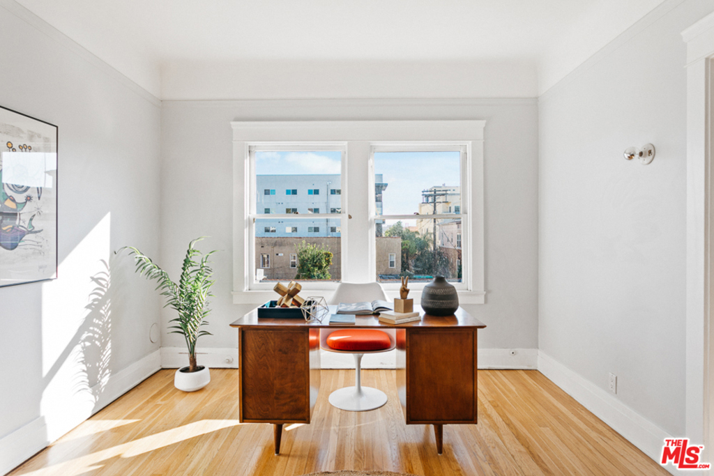The historical Miramonte is an exemplary Italian Revival building sited on high ground in the heart of Koreatown. This beautiful corner unit consists of two combined apartments and provides an abundance of space, high ceilings and original hardwood floors. Large windows throughout offer optimum light and unobstructed Hollywood hill and city views. The spacious bedrooms overlook a classic courtyard and fountain. The kitchen has been updated for a minimal, modern experience offering a wolf range, stainless steel surfaces, brand new fridge and dishwasher. Master has separate sitting room/office and marble bathroom. No shared walls!! Includes a private garage, two storage areas, common BBQ, gardens, billiard and sun Room. Super Koreatown location near great shops & restaurants.