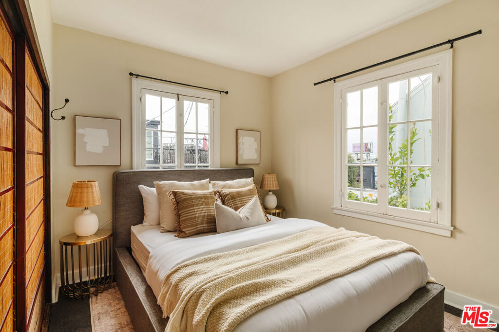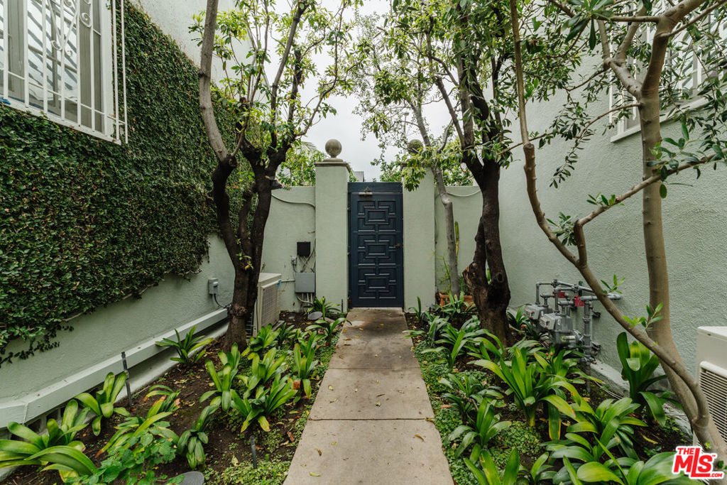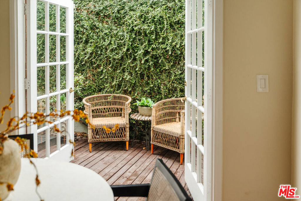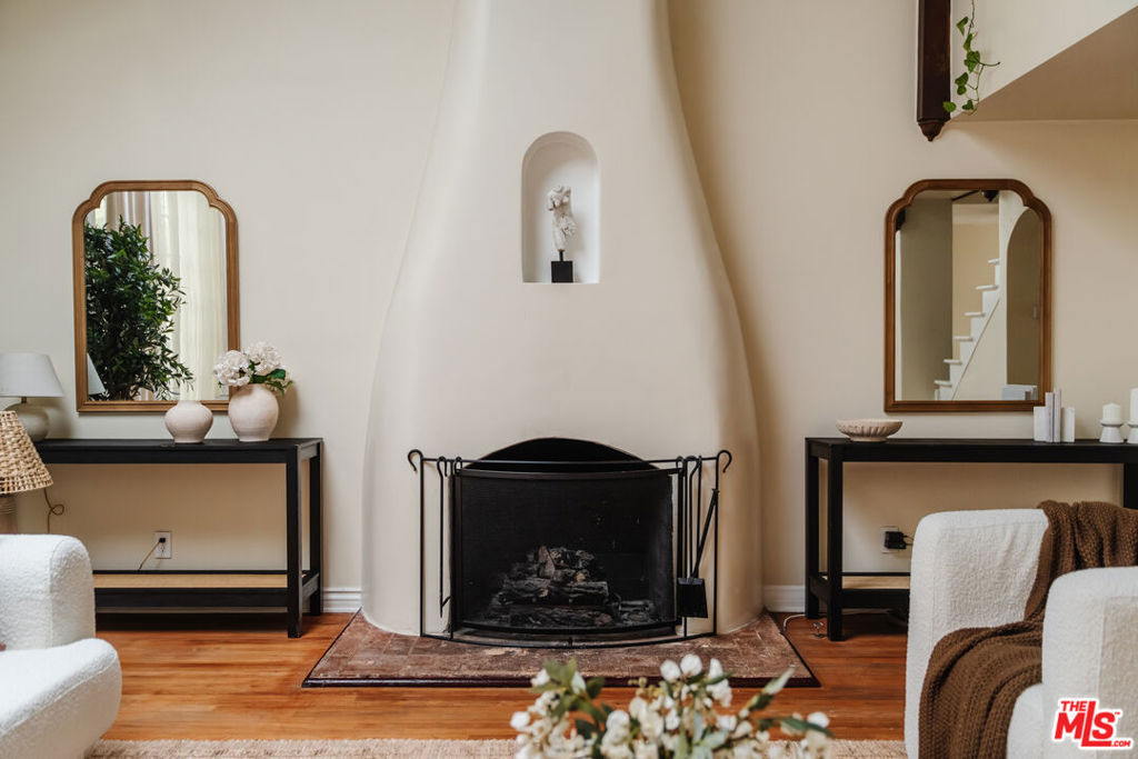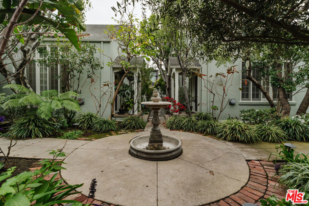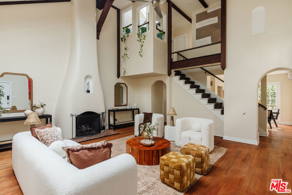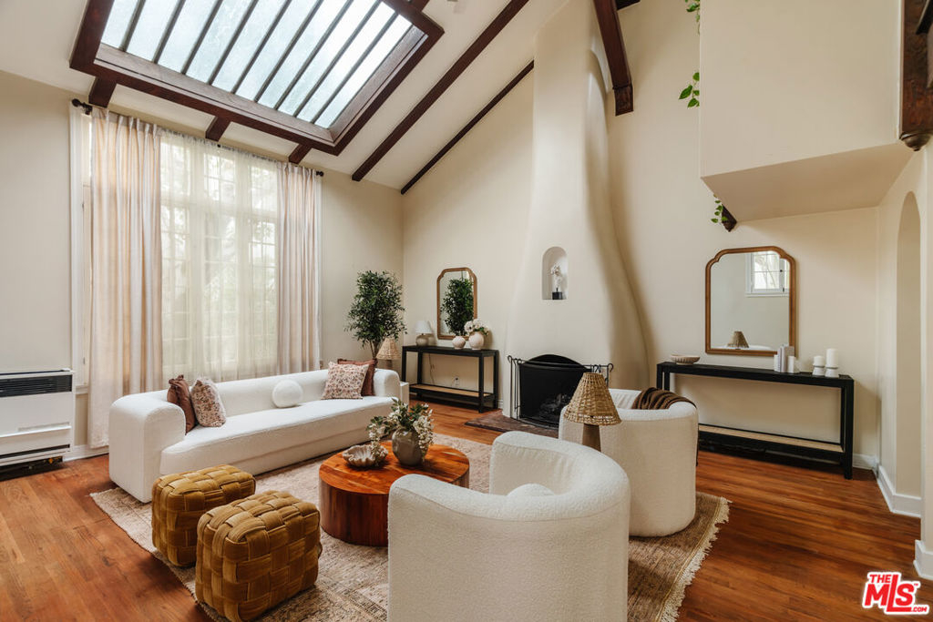 Nestled within a lush courtyard featuring a century-old fountain, this rare townhome awaits a quintessential artist's retreat, blending classic Spanish charm with old Hollywood allure. The front door opens into a grand two-story living room with dramatic cathedral ceilings, hand-carved beams, an adobe fireplace, and expansive floor-to-ceiling windowsall bathed in natural light from a skylight above. The inviting dining area, framed by romantic French doors, opens to a private, sun-drenched patio and connects seamlessly to a fully equipped kitchen featuring stainless steel appliances.On the second level, a well-appointed bedroom is accompanied by a beautifully updated bathroom. At the top of this three-level home is a sprawling, fully finished room that can accommodate all your needs, offering space for a bedroom, office, and cozy reading nook. Additional highlights include an in-unit washer/dryer, a powder room, and direct garage access. Set back from the street, this property is ideally located just blocks from the best dining, entertainment, and shopping on Melrose, Sunset, and Hollywood.