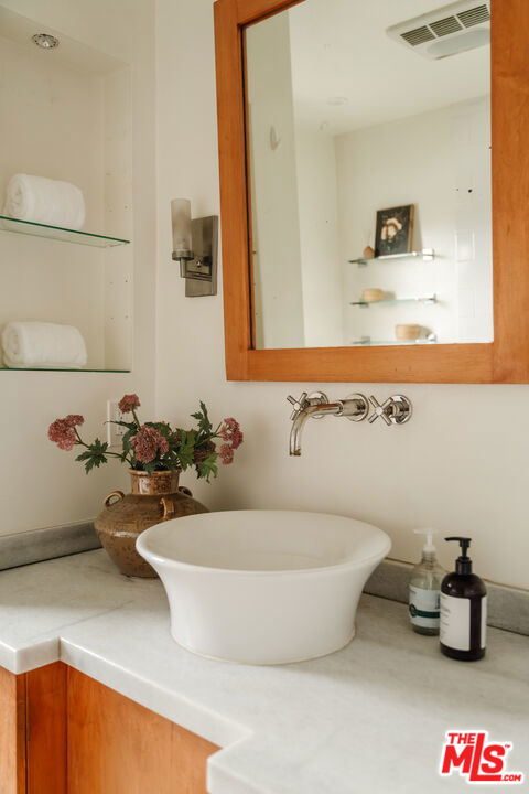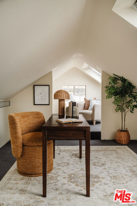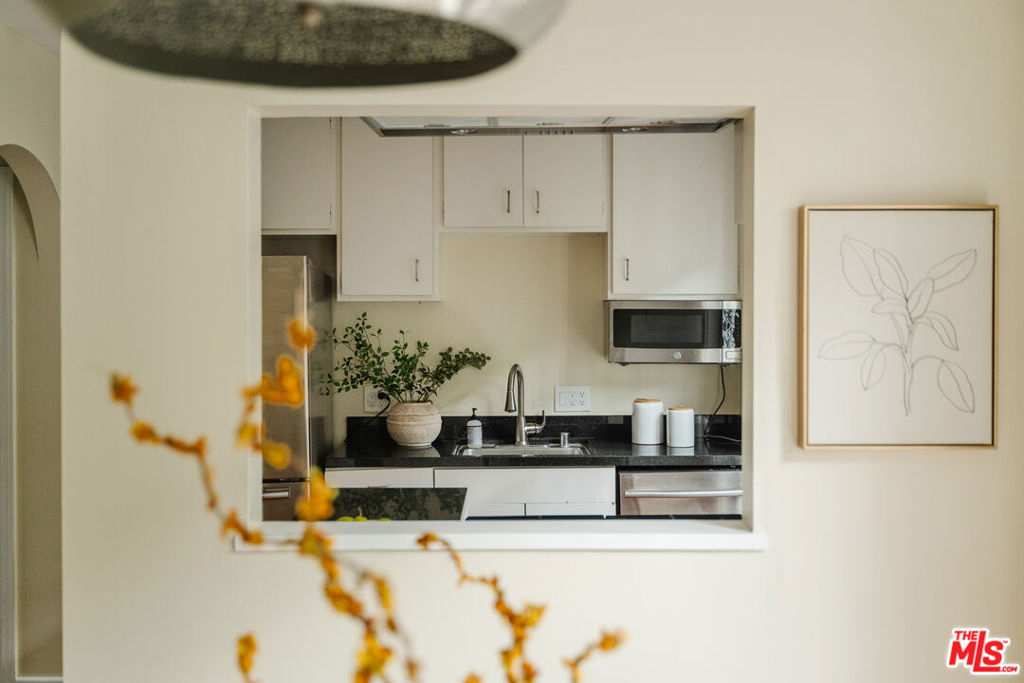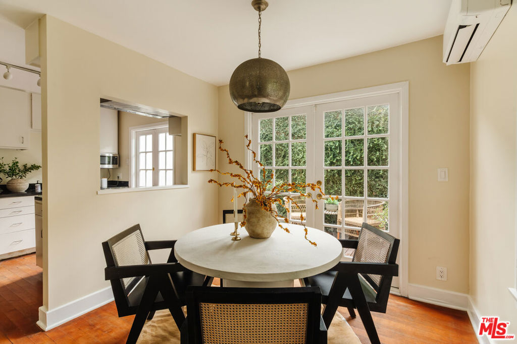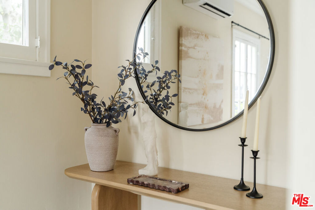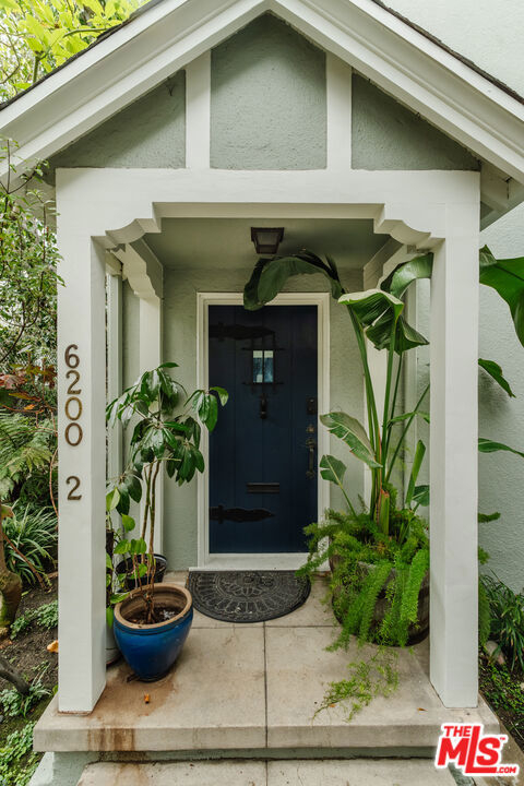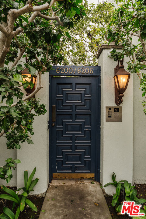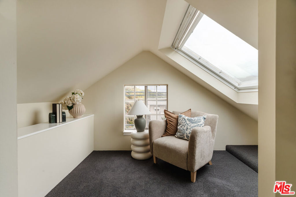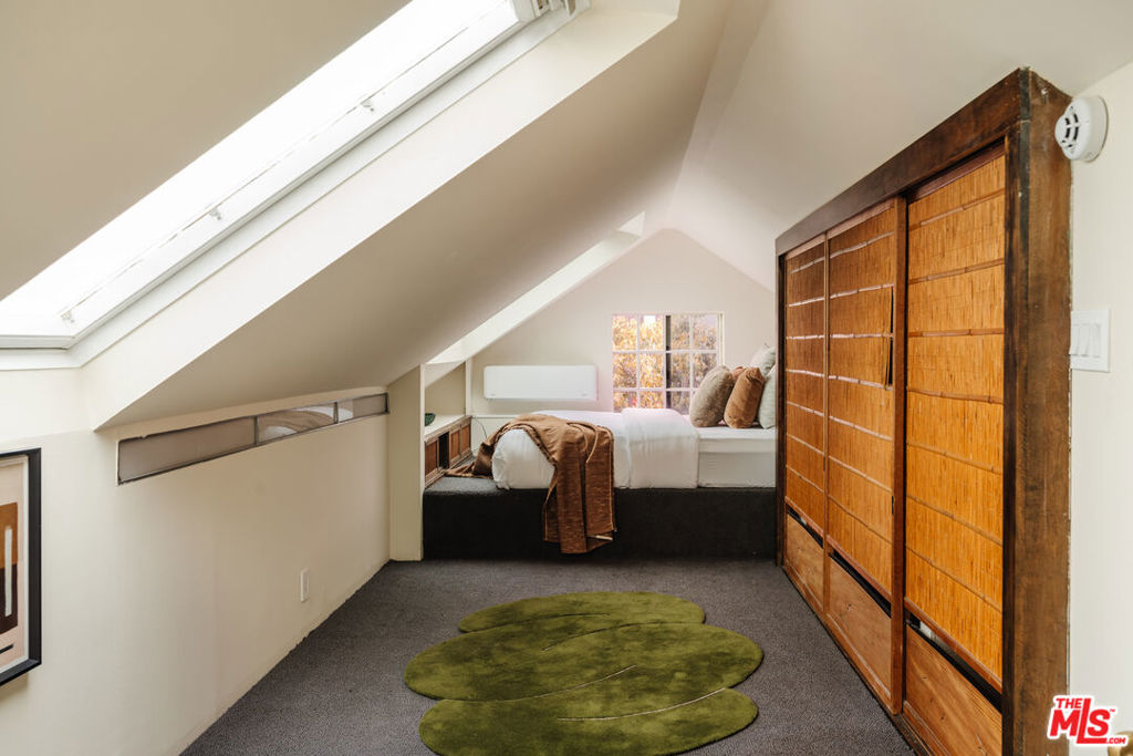 Nestled within a lush courtyard featuring a century-old fountain, this rare townhome awaits a quintessential artist's retreat, blending classic Spanish charm with old Hollywood allure. The front door opens into a grand two-story living room with dramatic cathedral ceilings, hand-carved beams, an adobe fireplace, and expansive floor-to-ceiling windowsall bathed in natural light from a skylight above. The inviting dining area, framed by romantic French doors, opens to a private, sun-drenched patio and connects seamlessly to a fully equipped kitchen featuring stainless steel appliances.On the second level, a well-appointed bedroom is accompanied by a beautifully updated bathroom. At the top of this three-level home is a sprawling, fully finished room that can accommodate all your needs, offering space for a bedroom, office, and cozy reading nook. Additional highlights include an in-unit washer/dryer, a powder room, and direct garage access. Set back from the street, this property is ideally located just blocks from the best dining, entertainment, and shopping on Melrose, Sunset, and Hollywood.