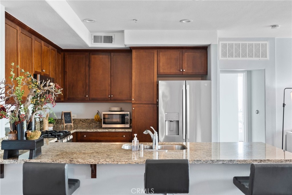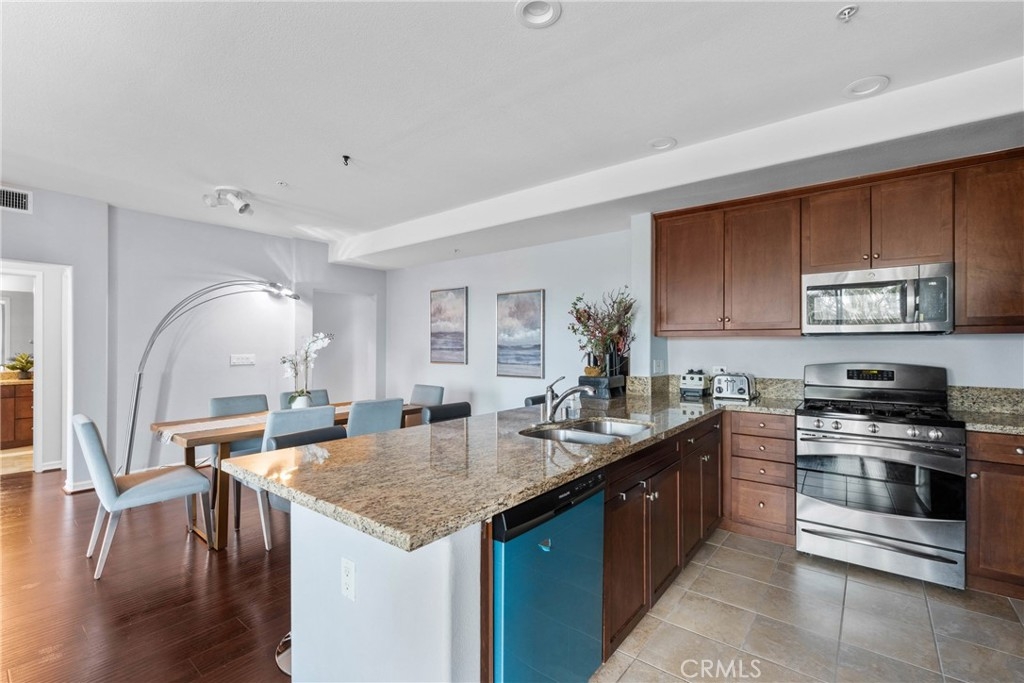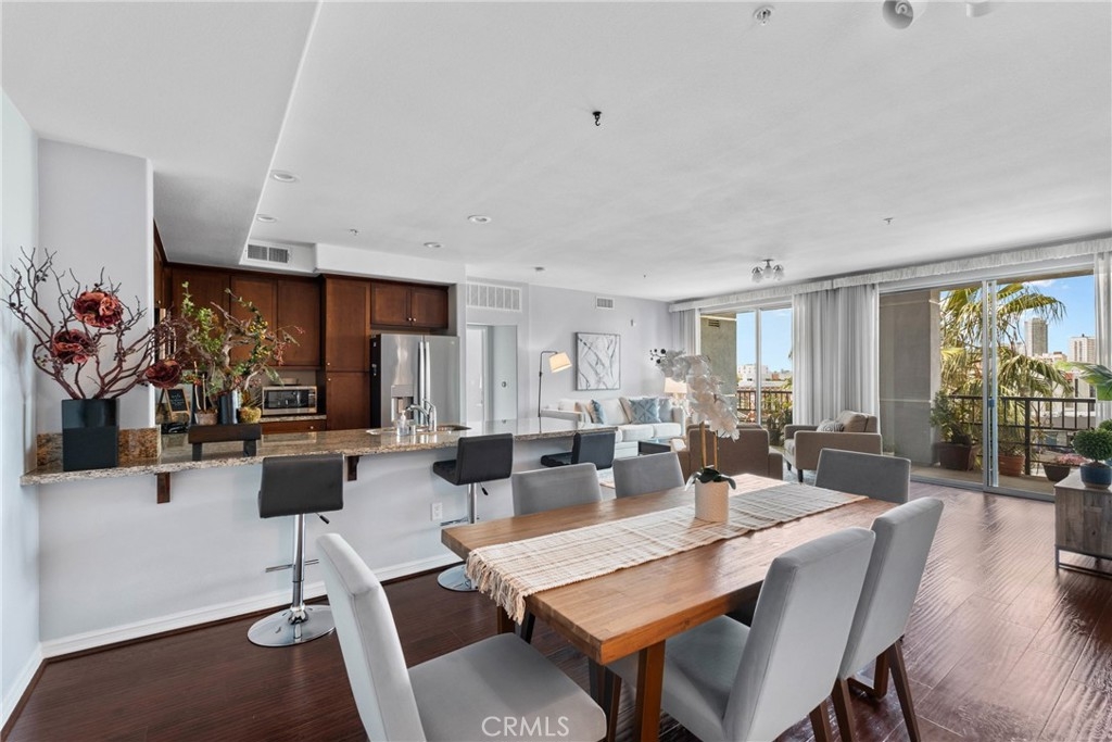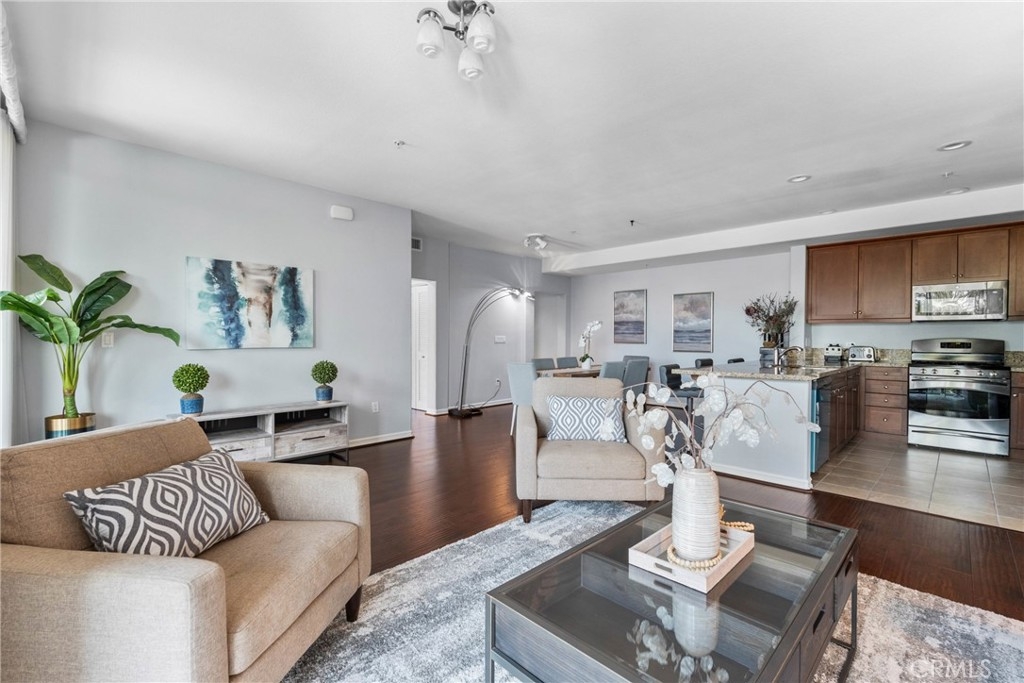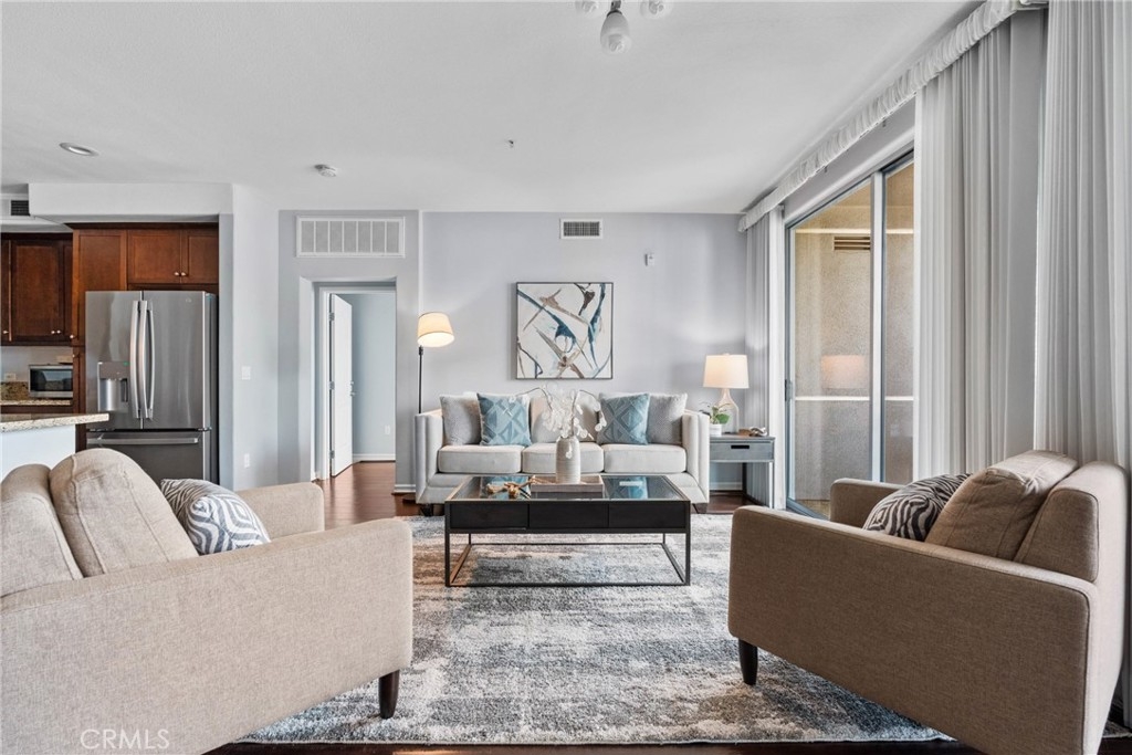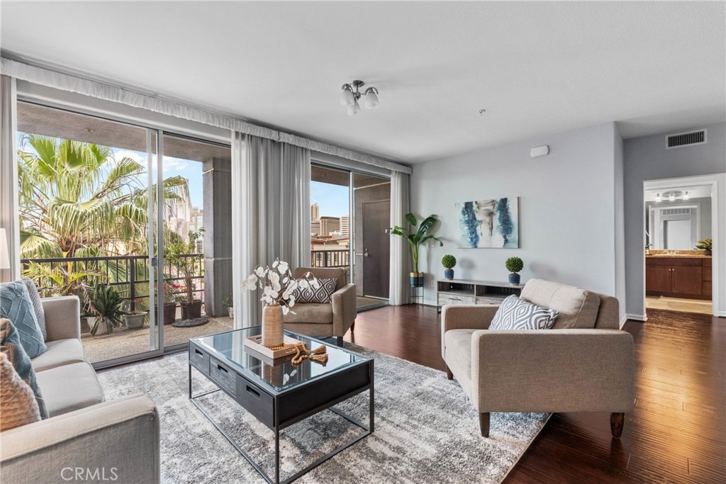 Step into elevated urban living at Mura by Pulte Homes—a JD Power award-winning community located in the heart of Downtown LA’s dynamic Arts District and Little Tokyo. This impeccably styled 2-bedroom, 2-bath condo offers the perfect blend of modern luxury and artistic flair, ideal for people who crave sophistication and inspiration. Soaring double sliding doors open to a dual balcony that frames jaw-dropping VIEWS of the Downtown skyline, while warm wood flooring, sleek granite countertops, and stainless steel appliances add an upscale yet welcoming touch. The open-concept chef’s kitchen features a peninsula island that invites connection and conversation—whether you’re hosting a wine night or enjoying a cozy morning coffee. The spacious primary suite is your private sanctuary, boasting a walk-in closet and spa-inspired en suite with dual sinks. Additional highlights include recessed lighting, central heat/AC, an in-unit washer and dryer, and a dedicated storage room. Mura pampers its residents with resort-style amenities: take a dip in the shimmering pool or jacuzzi, unwind in the Zen Garden, grill with friends in the BBQ courtyard, or lounge with a latte in the community coffee room. Stay fit in the on-site gym and rest easy with 24-hour security and guest parking. It comes with two tandem parking spaces for added convenience. Just steps from iconic hot spots like Manuela, Damian, Girl & the Goat, Soho House, The Row DTLA, and Babel—this is where high-end living meets culture, creativity, and connection. Don’t miss your chance to own a slice of LA luxury
