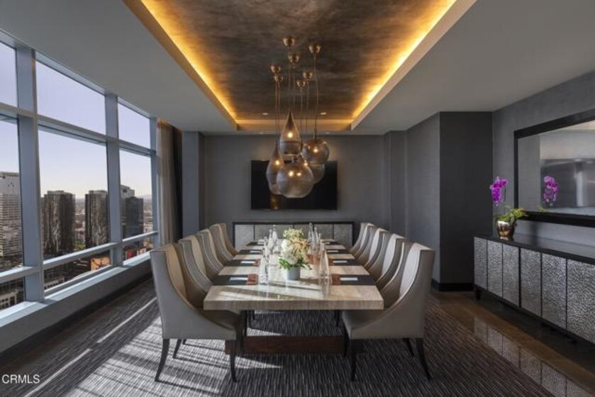 A statement in both scale and design, Residence 36J is a 36th floor corner home at The Ritz Carlton Residences at L.A. LIVE, offering sweeping north and west skyline views and a truly bespoke living experience. Spanning approximately 2,110 square feet, this 2 bedroom plus den, 3 bath residence is framed by floor-to-ceiling windows that capture Downtown Los Angeles in cinematic scale, filling every room with natural light from sunrise through evening city lights.What truly distinguishes this residence is the presence of a seasoned and discerning design eye throughout, resulting in a home where every detail feels intentional. A dramatic black marble entry creates a striking sense of arrival, flowing into custom black wood flooring that runs throughout the home. High ceilings enhance volume and light, while custom recessed lighting has been thoughtfully designed to define living zones and create layered ambiance. This lighting is paired with custom wall switches in the bedrooms and hallways, allowing each space to transition effortlessly from day to night. Automated sheer and blackout shades are fully integrated into the system, offering refined, intuitive control over light and privacy throughout the residence.The open-concept living and dining areas balance refinement and comfort, anchored by clean architectural lines and a sleek kitchen equipped with premium Gaggenau appliances, ideal for both everyday living and entertaining. A formal entry adds structure and elegance, while generous storage is seamlessly integrated throughout. The primary suite serves as a serene retreat with a spa inspired bath and ample storage. The flexible second bedroom features custom fabric wrapped walls, adding warmth and texture. A separate den, also enhanced with fabric wall detailing and a custom floor-to-ceiling built-in cabinet, offers a versatile setting for a home office, library, or media room. Three luxurious bathrooms, two featuring distinctive crocodile textured wall treatments, complete the thoughtfully designed interior.Life at The Ritz Carlton Residences is defined by ease, discretion, and elevated service. Residents enjoy 24-hour valet and concierge, rooftop pool with private cabanas, fitness center, screening room, owner's lounge, and seamless access to hotel services including housekeeping, in-room dining, and spa offerings. Ownership also includes access to Onvia, the Ritz Carlton Owner Recognition Program, offering elevated concierge services.